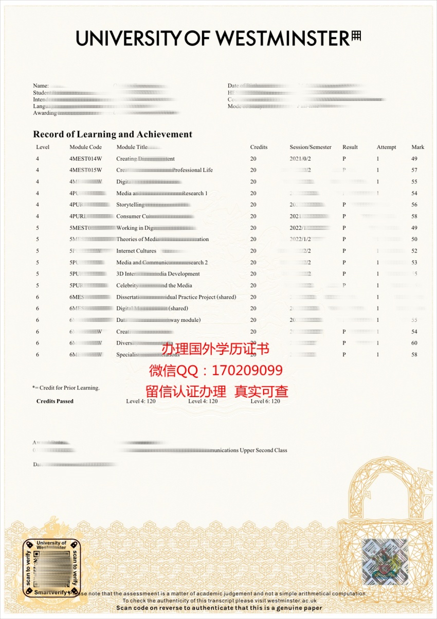 英国威斯敏斯特大学成绩单University of Westminster Diploma